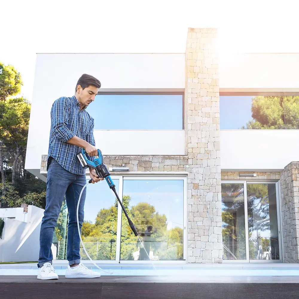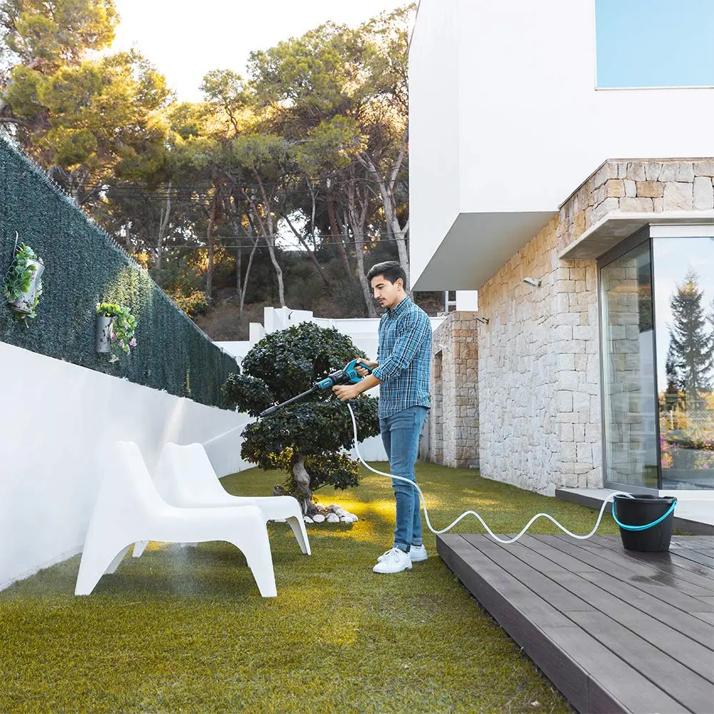 Gracias a su diseño inalámbrico y su capacidad para trabajar con un cubo de agua, puedes llevar esta hidrolimpiadora prácticamente a cualquier lugar. Esto la hace ideal para quienes buscan limpiar o muebles de exterior sin depender de tomas de corriente cercanas.