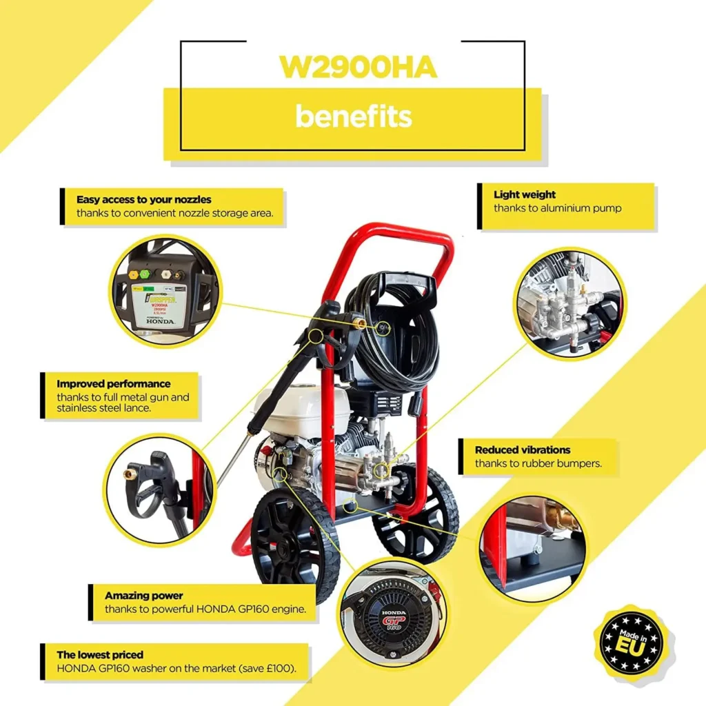 • Mayor potencia: El motor Honda GP160 ofrece una presión que realmente se nota. Hablamos de más de 200 bares, y lo mejor, sin caídas de rendimiento.