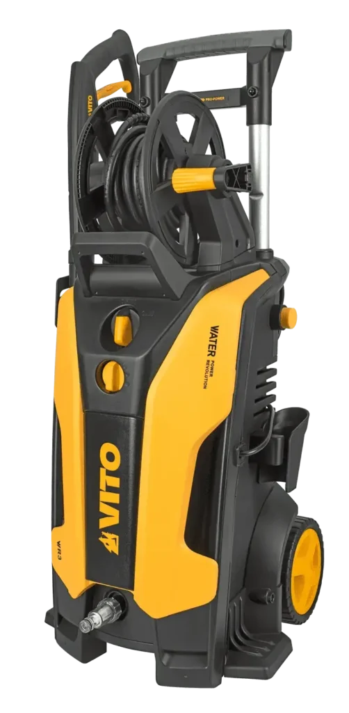 - Diseño compacto y ligero : La hidrolimpiadora VITO VIML115WR1 destaca por su construcción compacta y peso ligero, lo cual facilita su almacenamiento en espacios reducidos, como armarios domésticos. Su diseño es ideal para quienes buscan un equipo fácil de manejar y transportar, ya que incluye una asa ergonómica y ruedas para un desplazamiento sencillo.